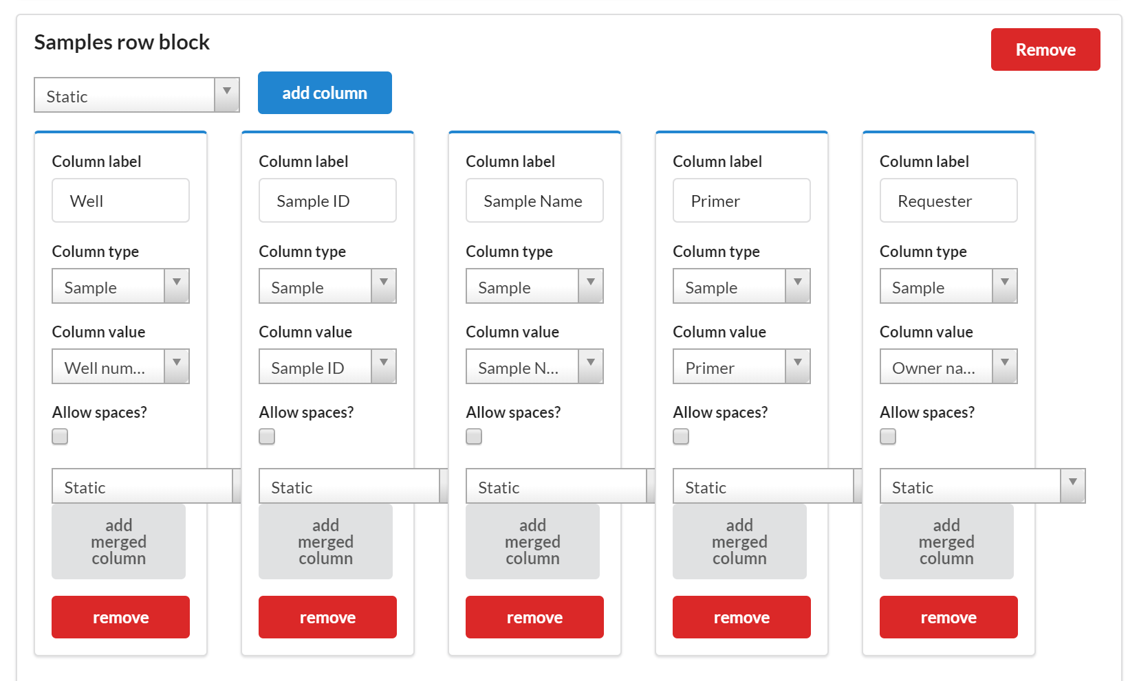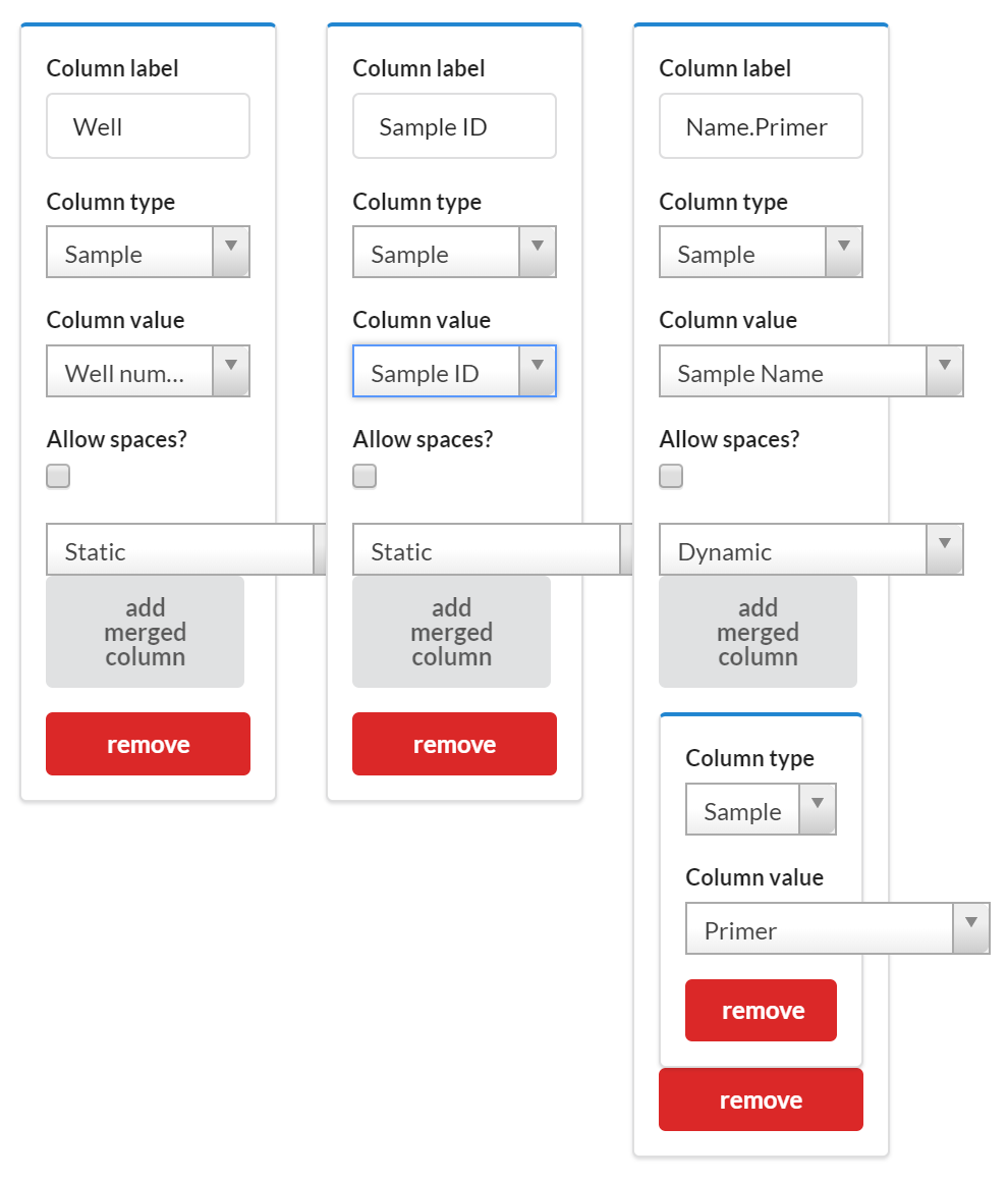 Merged columns allow information entered separately by the user to be combined into one value for the instrument. For example, there may be separate columns on the sample form for the user to enter “Sample name” and “Primer name”, but the instrument requires that information to be in one column as “Sample name.Primer name”.