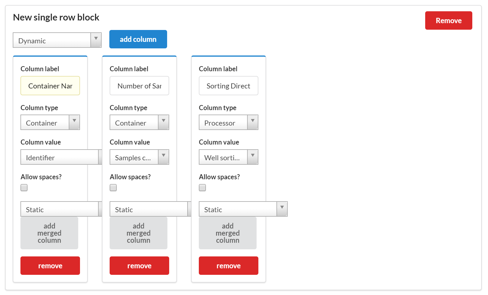 Dynamic columns populate a value using information from the container, the processor, or the samples. Your selection in the "column type" dropdown of a dynamic column will determine if your column value should pull information from the container, the processor, or the sample.