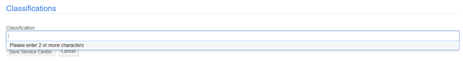 You may select multiple classifications for your core that allow for your site to be searched in other areas of iLab. The classifications are pulled from the eagle-i-ontology classification system. The iLab system will begin to search the eagle-i-ontology database after you have entered two letters. Select the correct classification from the drop-down box to associate it with your site.
