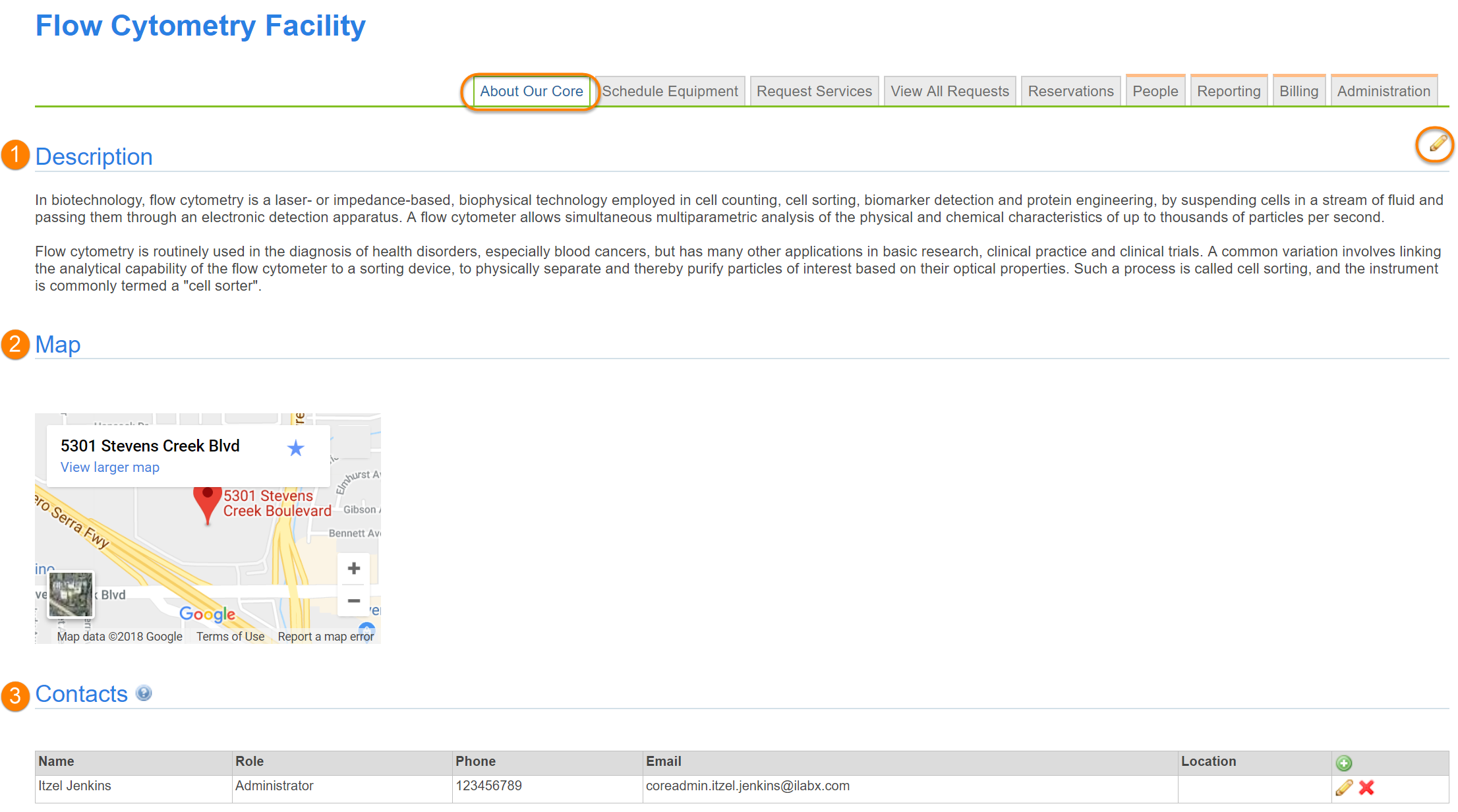 The About Our Core tab is used to manage the information that displays to users about your facility. This is the only page of your site that is viewable without being logged into the iLab application. Editing this page can be broken down into six sections: