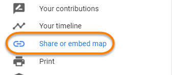 Once on Google Maps' website, search for the directions, map, or Street View image you want to add to your Core page. Click on 'Menu' icon, then on 'Share or embed map'.