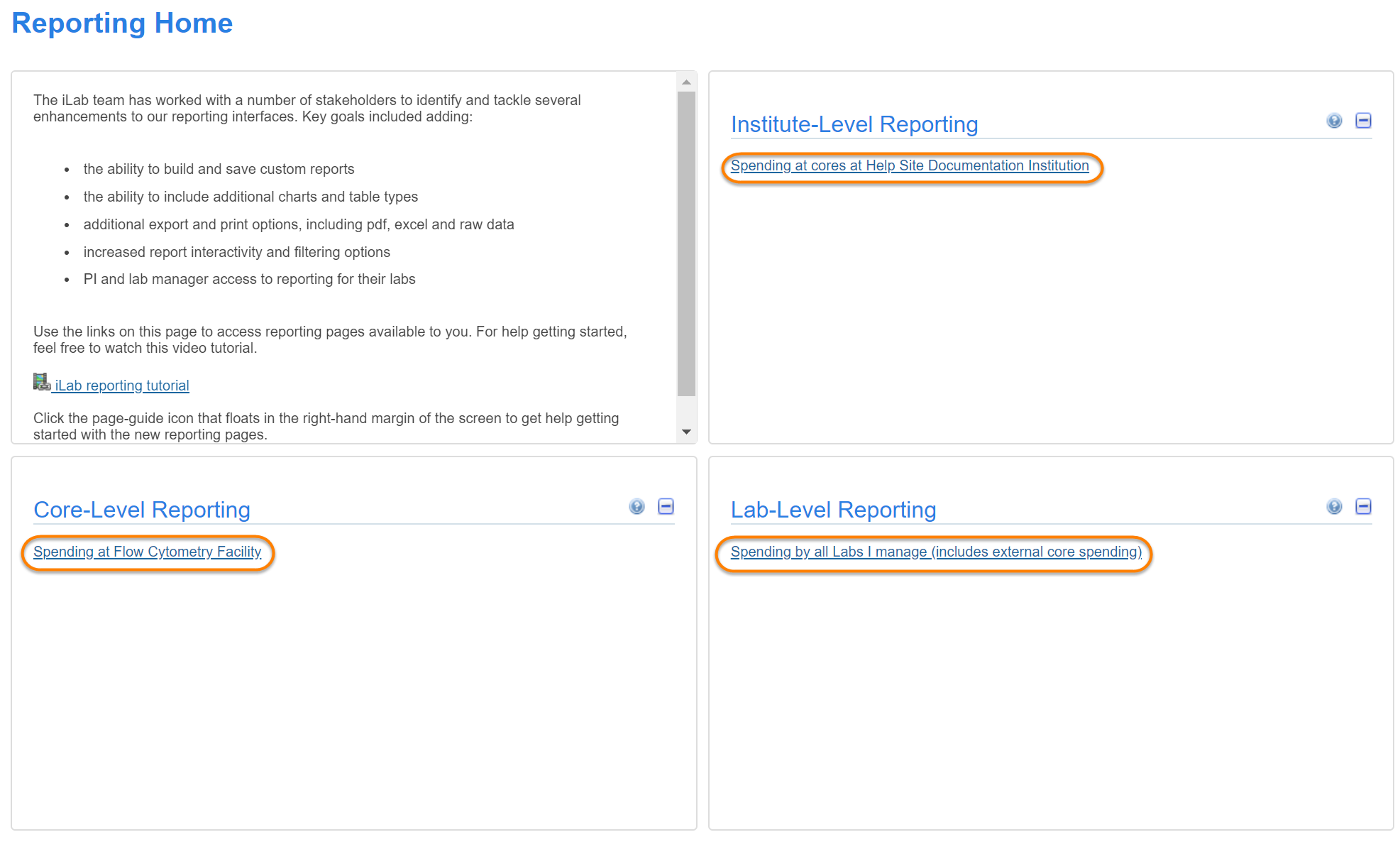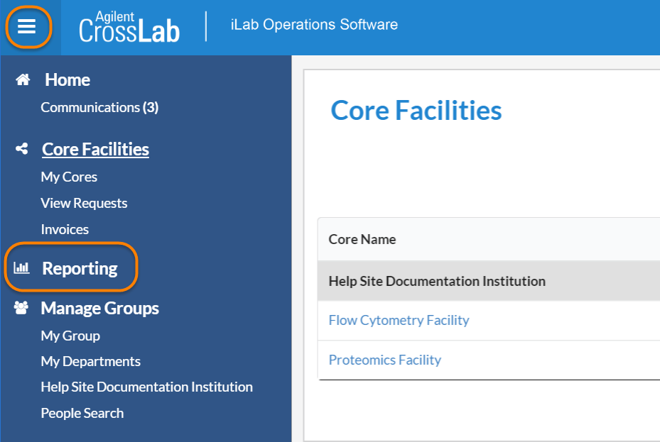 Most users with an administrative role in iLab system will be able to utilize the reporting functionality. Reporting allows users to generate reports on much data underlying the iLab workflow, but in all cases their access to this data is restricted to the data they have control over (e.g. a core manager can report on all data for their core, while a PI can report on all data relevant to their lab/group).