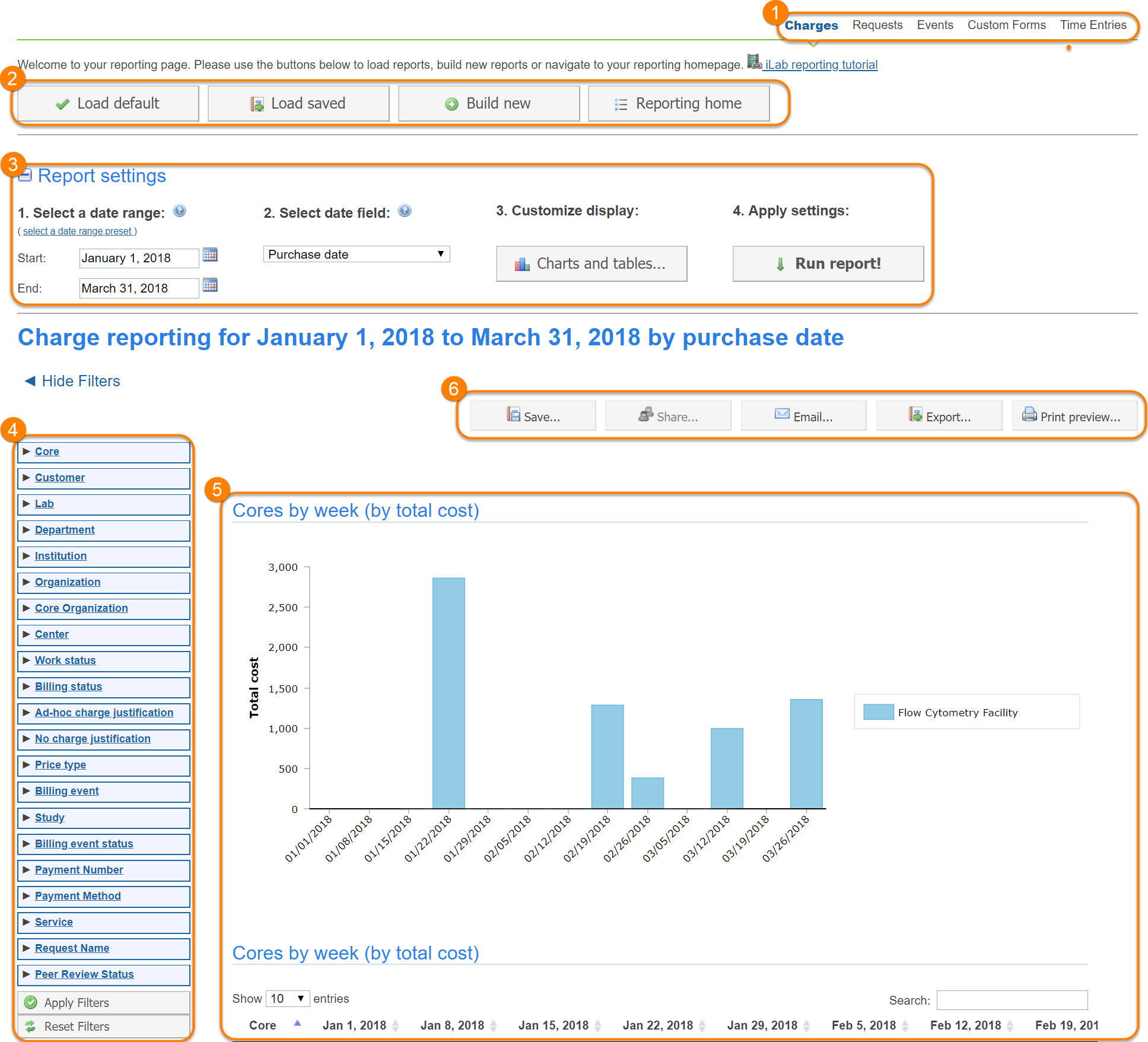 - Report type: iLab provides reporting on a range of different data sets, including charges, requests, events, custom forms and time entries and requisitioning, if applicable.
