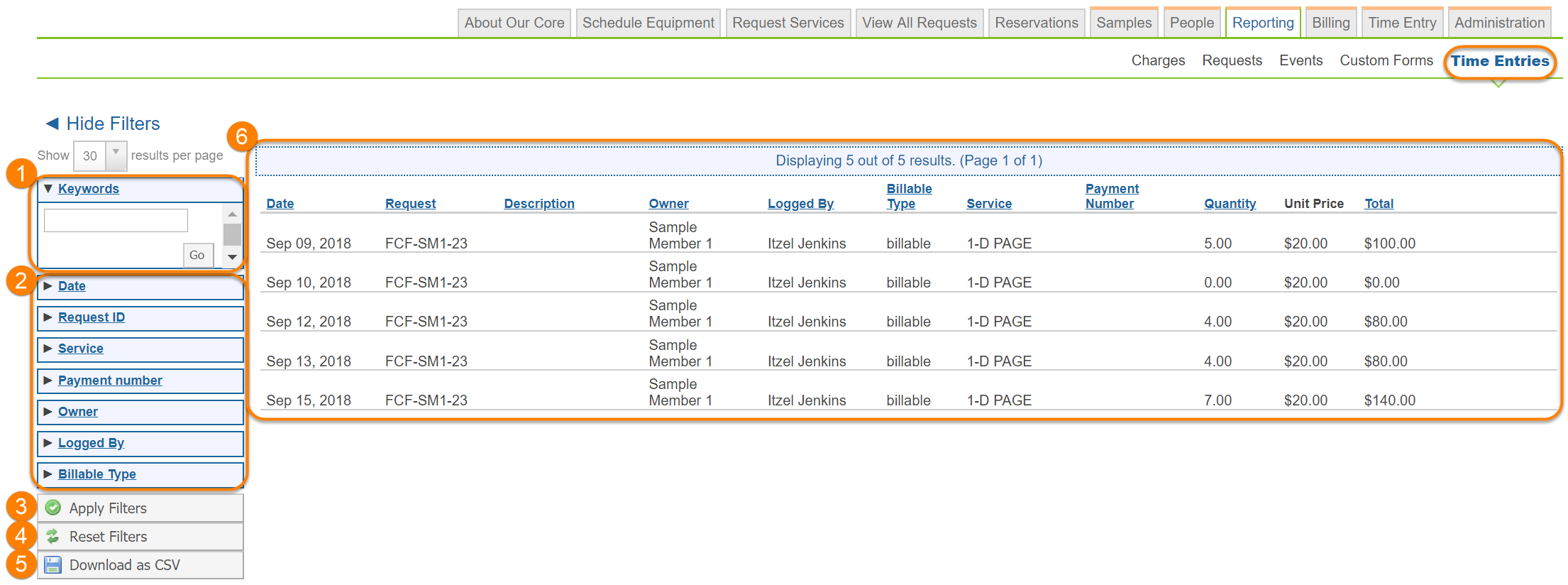 The Time Entries report is another core-level report that provides reporting on Time Entry data (if enabled for the core):
