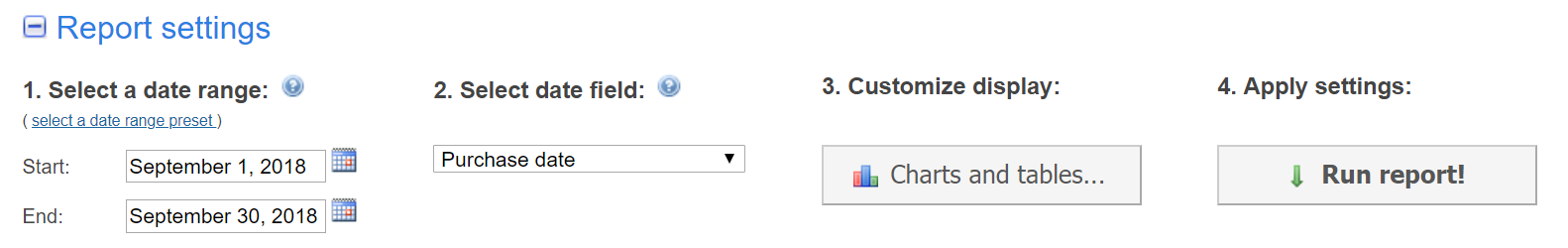 - Apply settings: Click the "Run report!" button to apply the previous settings and generate/update the report. This will show any applicable panels that were not yet visible.