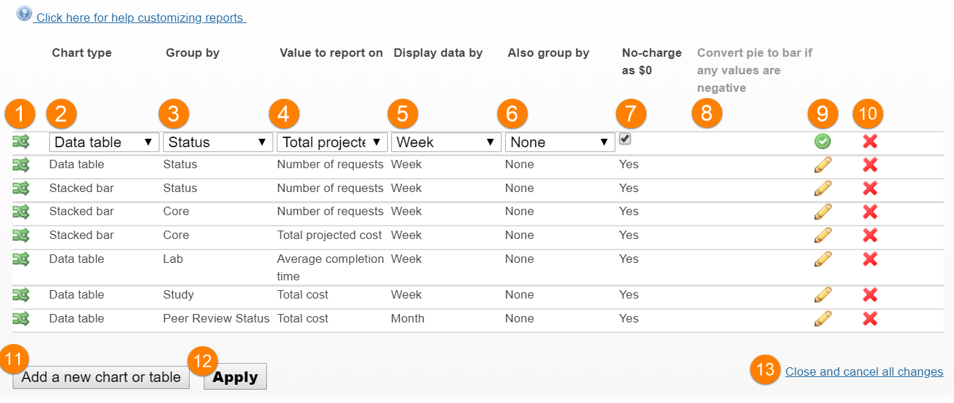 Each exhibit in the report can be fully configured, and exhibits can be easily added and deleted. Note that to change an existing exhibit, you need to first click on the pencil icon in column 9:
