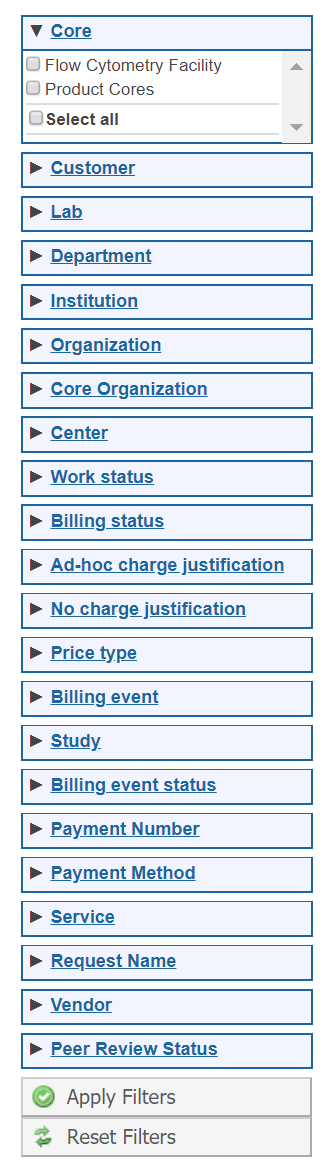 Select one or more filter criteria to narrow down the data included in the report. Expand criteria by clicking on the little arrow, and then use the checkboxes to determine which specific entries to include. For more information on the fields available for each report type, see Reporting Field Details .