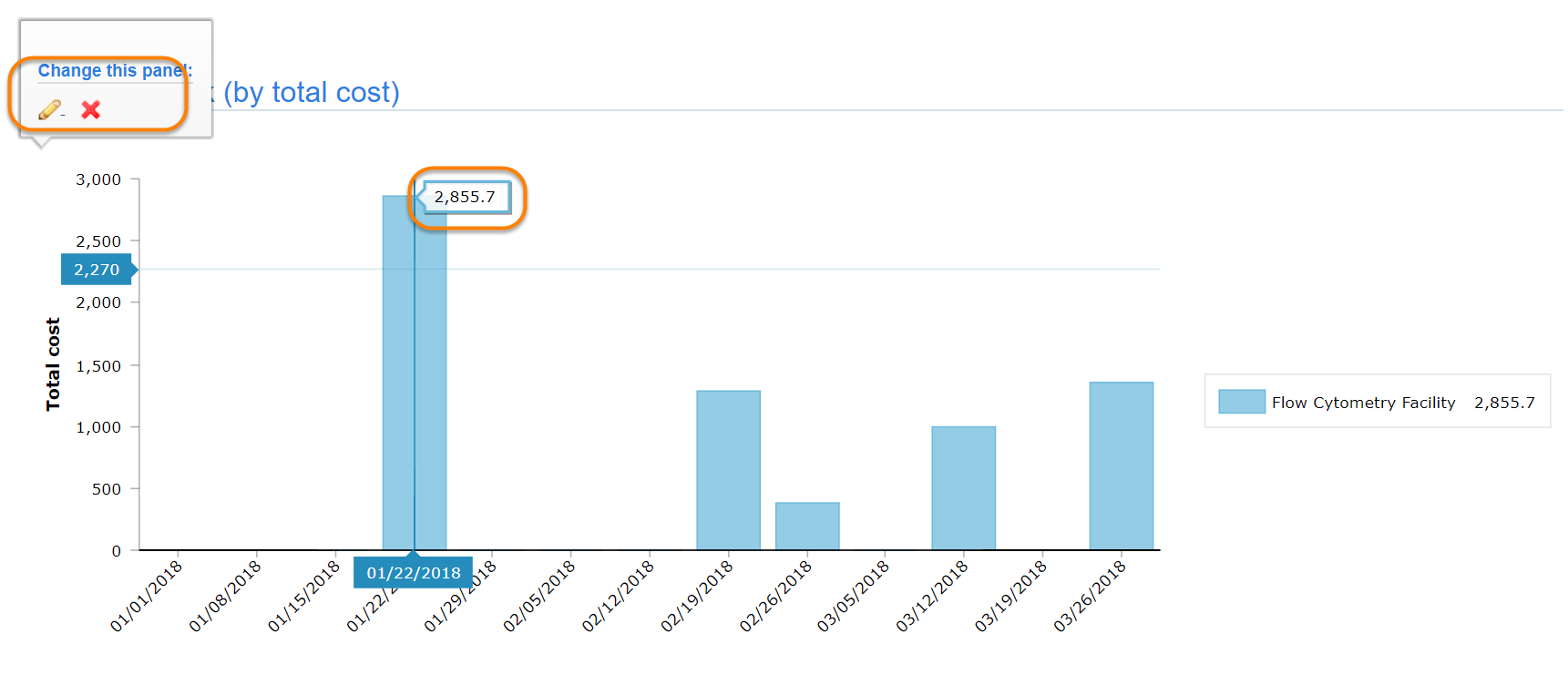 - Charges: report on the individual financial charges generated by core facilities, e.g. quantify, price, type, timing, etc.