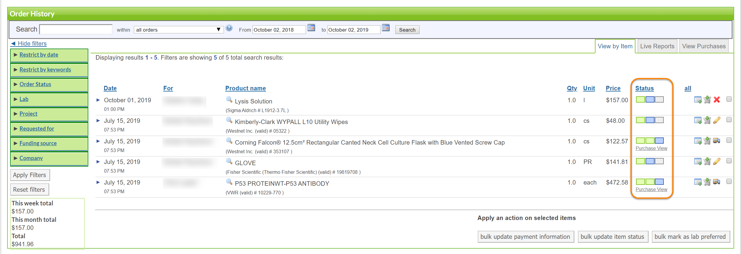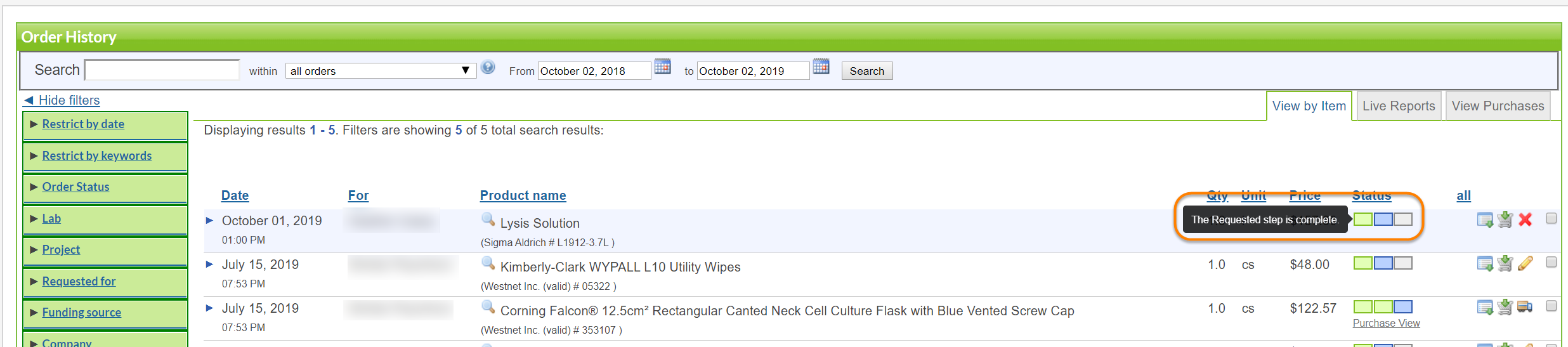 A list of all orders, past and present, will display. The status bar will indicate the status of the order: