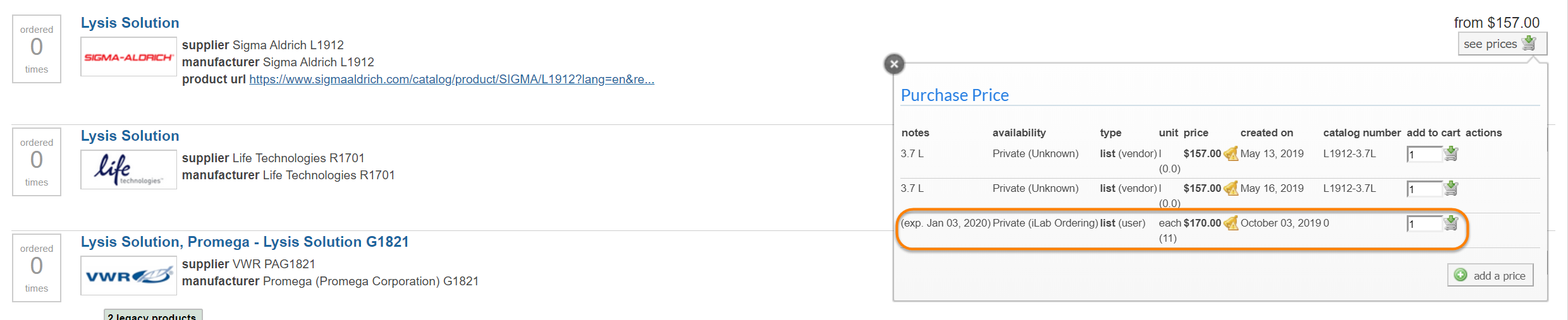 You may also save the price for one-time use by clicking one time use button. When you create a price for one time use, the item is automatically saved to your cart, and the price will NOT display with the others.