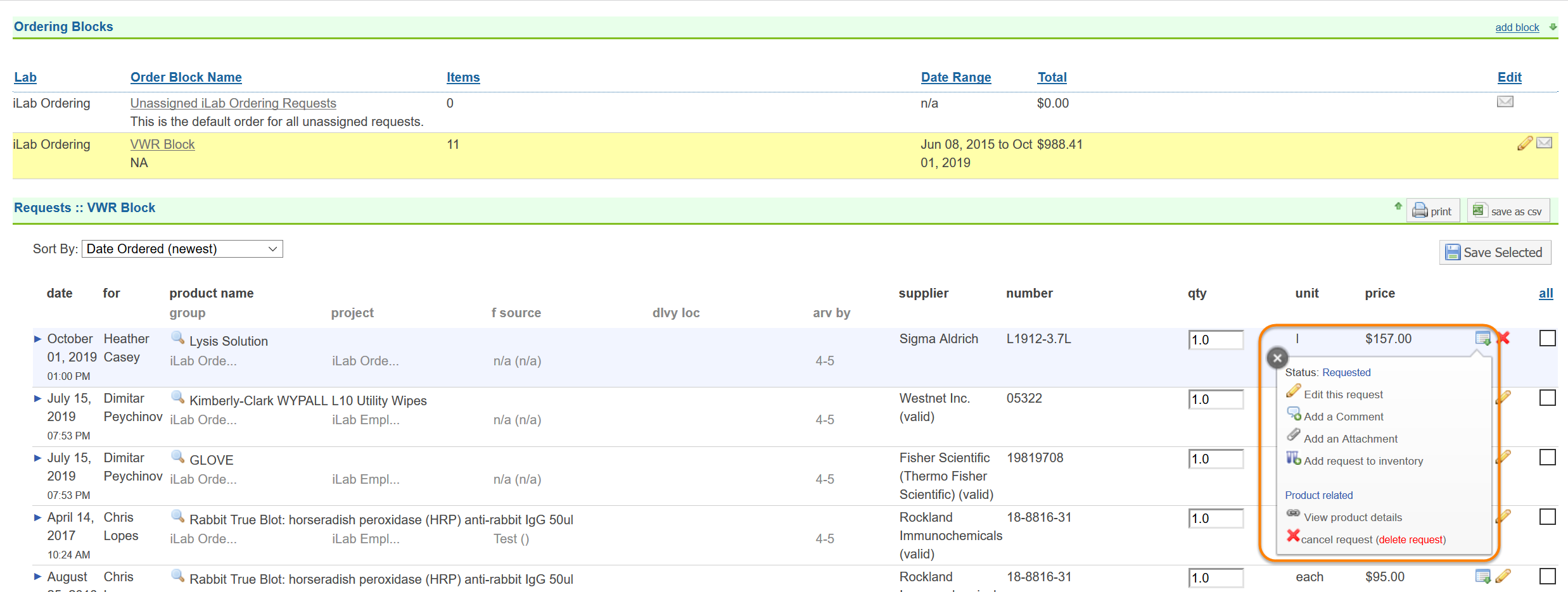 - EDIT THE REQUEST: To edit elements of the request, click on Edit this Request. You may also click to be clue arrow to edit the request. You may also click on the pencil beside the order without opening the options window.