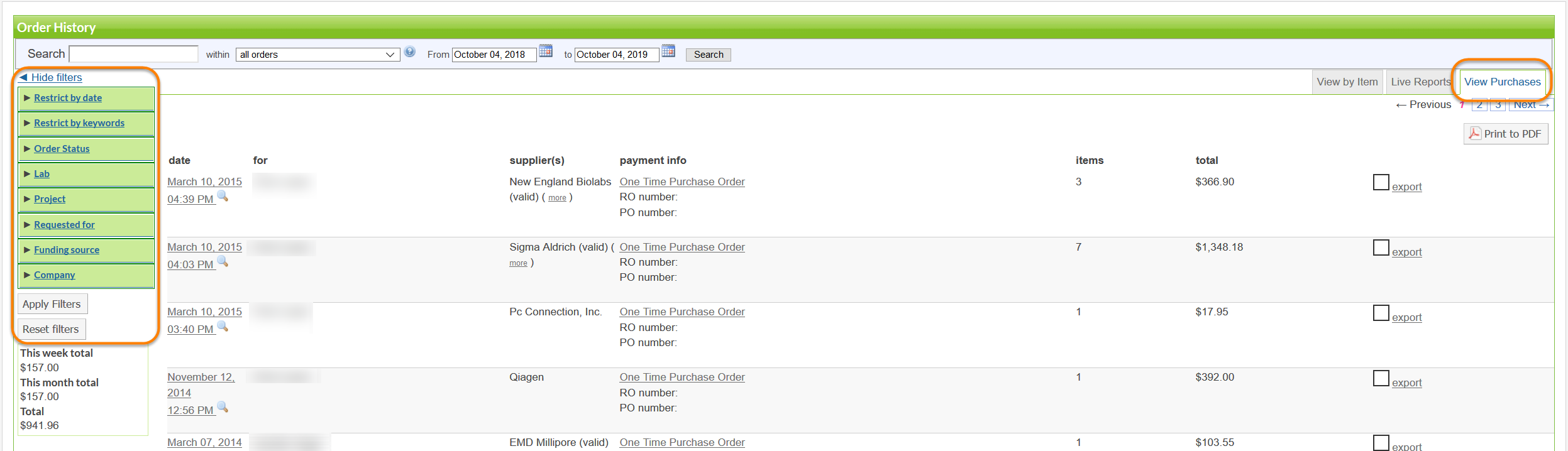 You can also view previous orders by first clicking Order History, and then clicking on the View Purchases tab. To further narrow your results, use the filters.