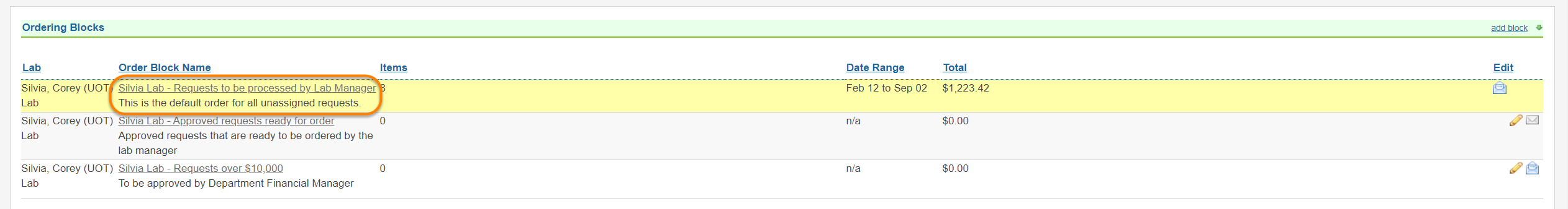 NOTE: Most labs will only have one approver and not require multiple approval blocks. Fore more information about setting up approval blocks, see Set Up Order Blocks.