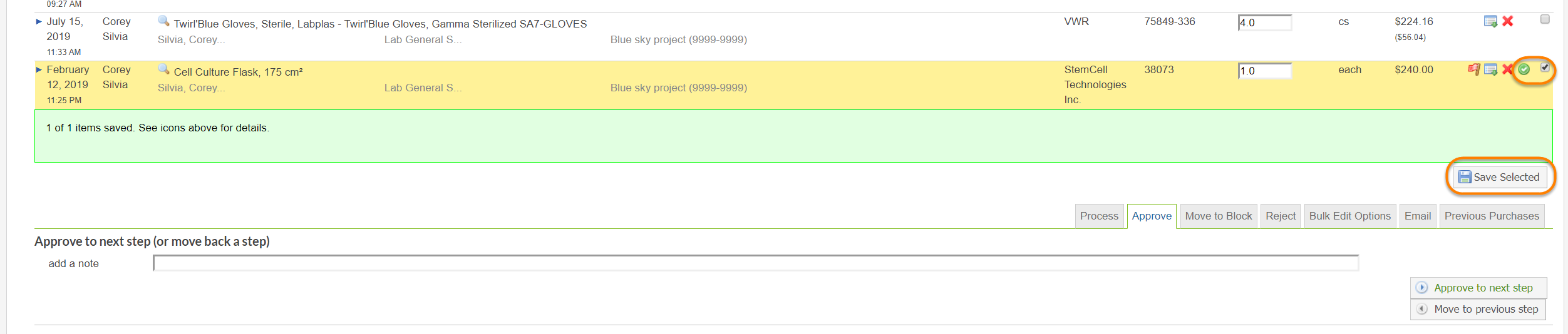 The requests will highlight yellow. Click save selected. NOTE: You MUST save requests before you may process them. A green arrow will display beside requests that have been saved.