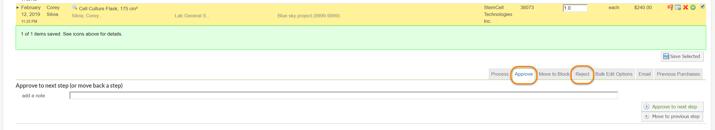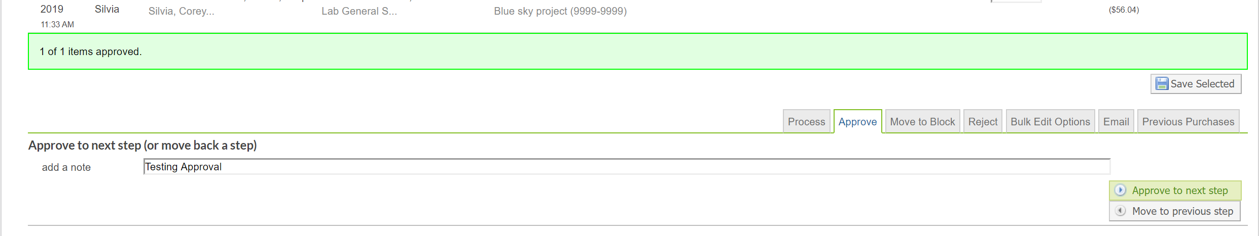 If you select approve, you will have the option to approve to the next step or move to previous step. To approve, click approve to the next step. This moves the order to the next step in the approval process. You will see a message confirming this.