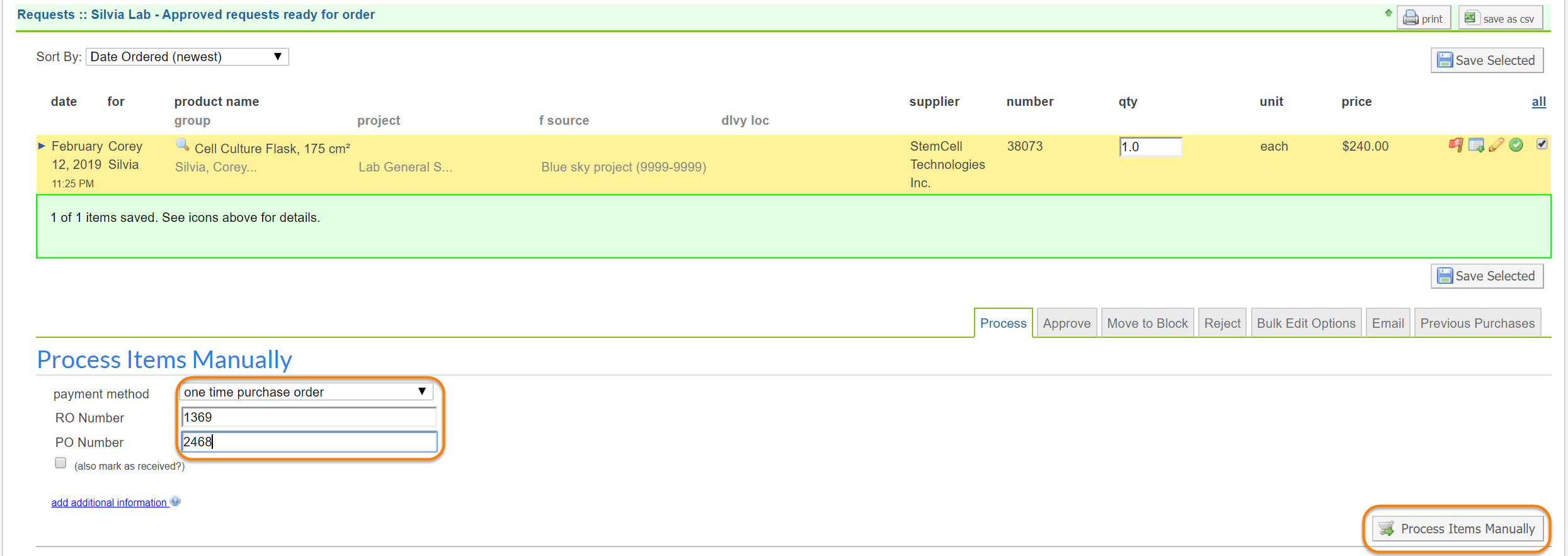 Click on the Process tab. In the PO number or RO number fields, record the confirmation number from the vendor website along with any other pertinent information (like tracking number, for example). Then click Process items manually.